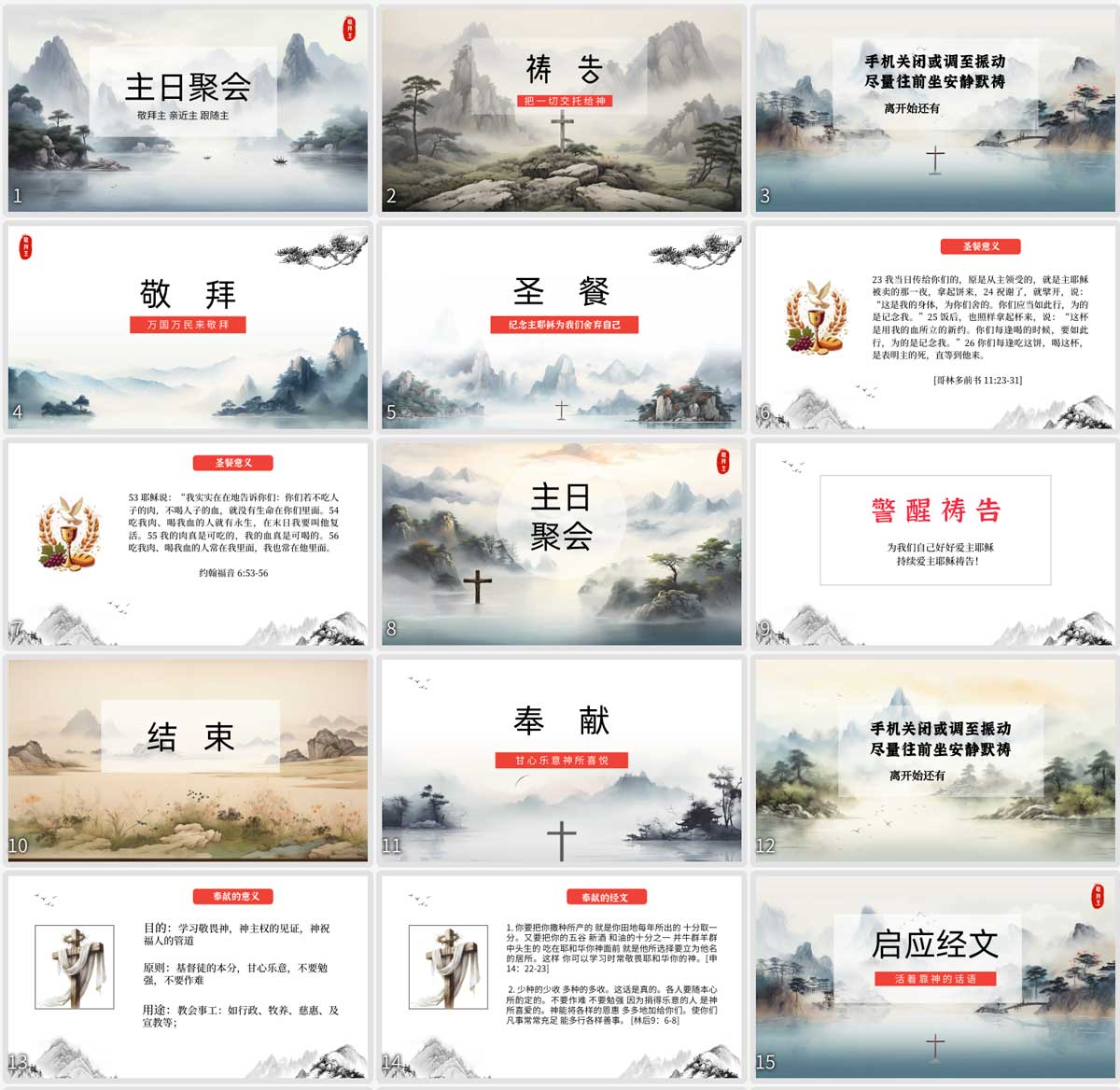 中国水墨山水,本次多媒体主日投影的设计以红色为主题;